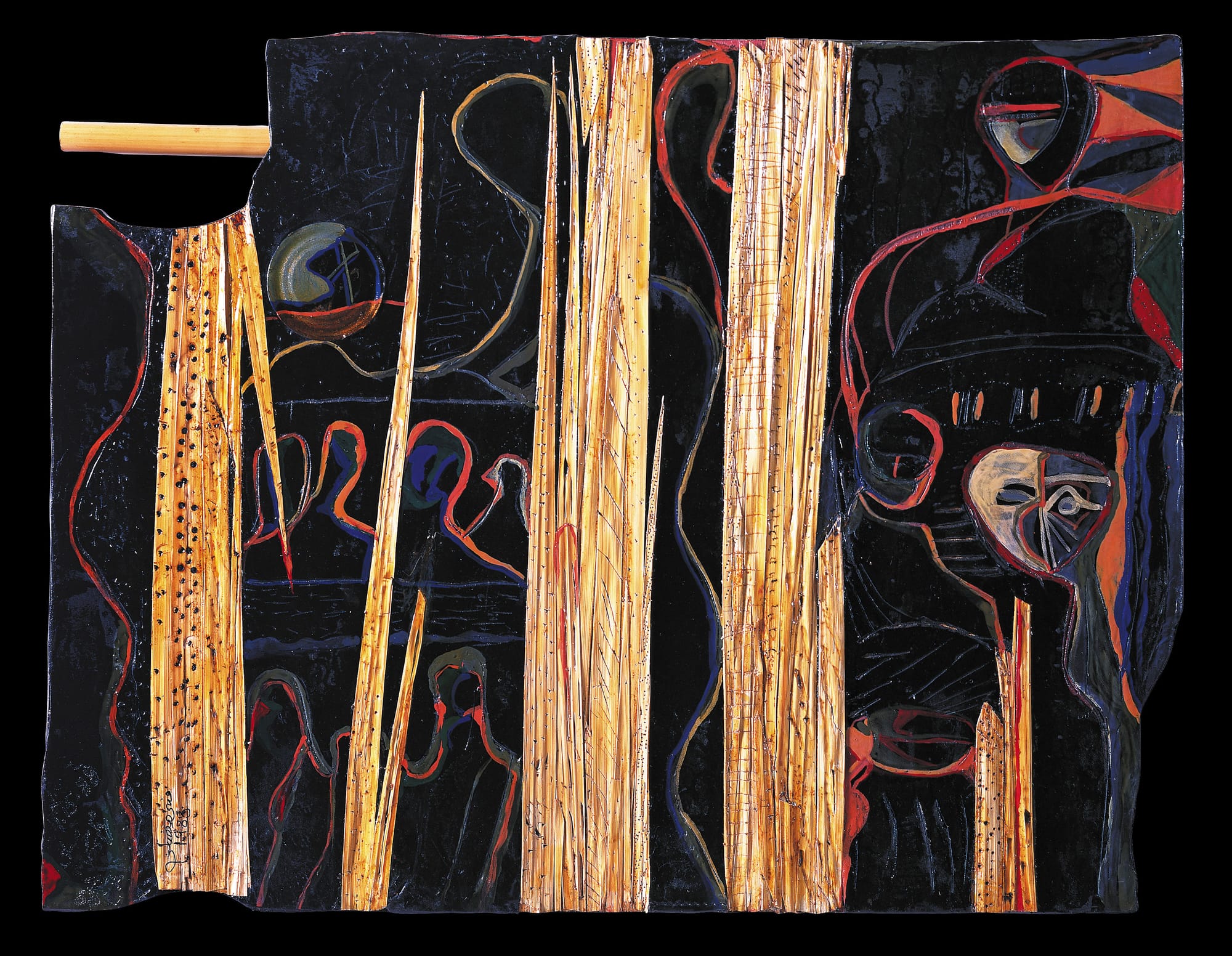 A surfeit of diverse and imaginative paintings constituted the second section, “Currents of Modernity.” The works were grouped under four themes—“Faces and Features,” “Nature and Landscape,” “Social Life,” and “Dreams and Symbols”—yet the accompanying texts offered little in the way of an original thesis. Many of these artists had studied or traveled abroad, particularly in the US and Europe. While their experiments with surrealism, expressionism, cubism, collage, and abstraction were not always stylistically innovative, they reflected a repertoire of societal anxiety, psychological angst, and a common quest for artistic languages capable of capturing the remarkable textures and tempos of these decades. Memorable examples included Khalil Hassan Khalil’s The Broken Mirror (1982), a deconstructed head portrait alongside an intact clock, and Dia Aziz Dia’s Father / A Study (1972), a composite portrait of the artist’s parent that appears both heroic and reticent. A compelling meditation on modernity, Faisal Samra’s enigmatic Untitled (1985) depicts a man, seemingly without arms, in a short-sleeved button-down shirt, standing over the black drain of a dry sink. Abdulsattar Al-Mussa’s The Sailor (1986) is a poignant carving on cardboard of a weather-beaten man in a shemagh, gazing ambivalently sideways as he lifts a cigarette to his lips; behind him, three boats bob on the water against a distant lighthouse.
