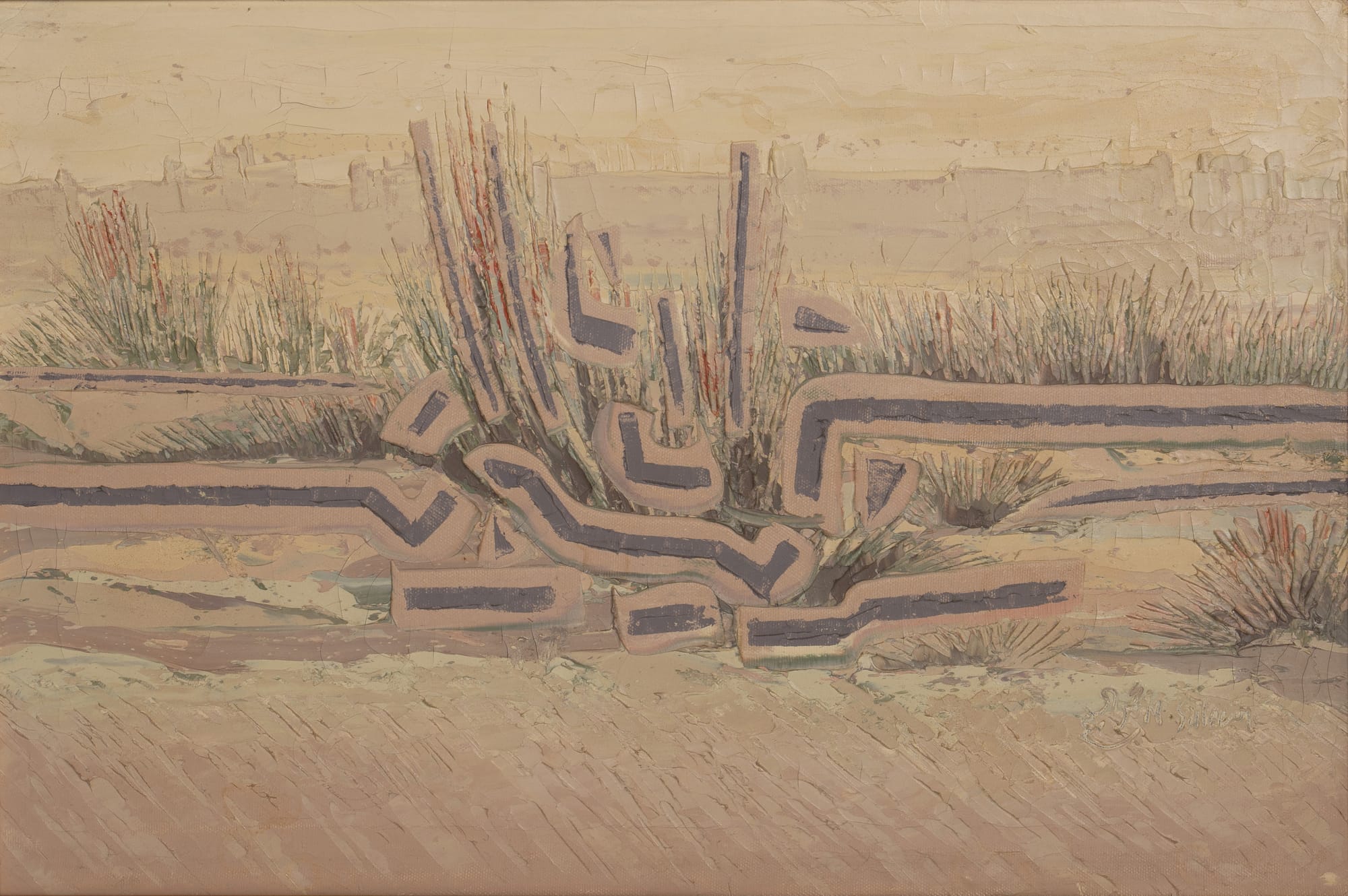 These existential debates coursed through “Bedayat: Beginnings of the Saudi Art Movement,” an important if unevenly curated exhibition of Saudi art from the 1960s to ’80s at Riyadh’s National Museum of Saudi Arabia. Curated by Qaswra Hafez, an éminence grise of Saudi Arabia’s modern and contemporary art scene, the show featured over 250 artworks by 73 artists. Unfortunately, the nondescript exhibition texts largely sidestepped the kingdom’s unprecedented political and social transformations during the period. Even cursory statistics would have helped convey the scale of the petrostate’s development: from 1960 to 1980, Saudi Arabia’s GDP soared from USD 1.75 billion to USD 164.5 billion, while its population more than doubled from 2.4 to 6 million. The first state-run television channel was launched in 1965, and by 1975, 1.5 million Saudis had access to television. Additionally, events such as the 1973 OPEC oil crisis, the Iranian revolution of 1979, and the Soviet invasion of Afghanistan that same year triggered domestic and foreign policy realignments with material impact on everyday lives. It is a pity that these indicators of modernity—industrialization, mass media, and urbanization, among others—received little attention in the exhibition texts, as they would have contextualized the artists’ courageous, often vulnerable explorations of the self, society, and environment.