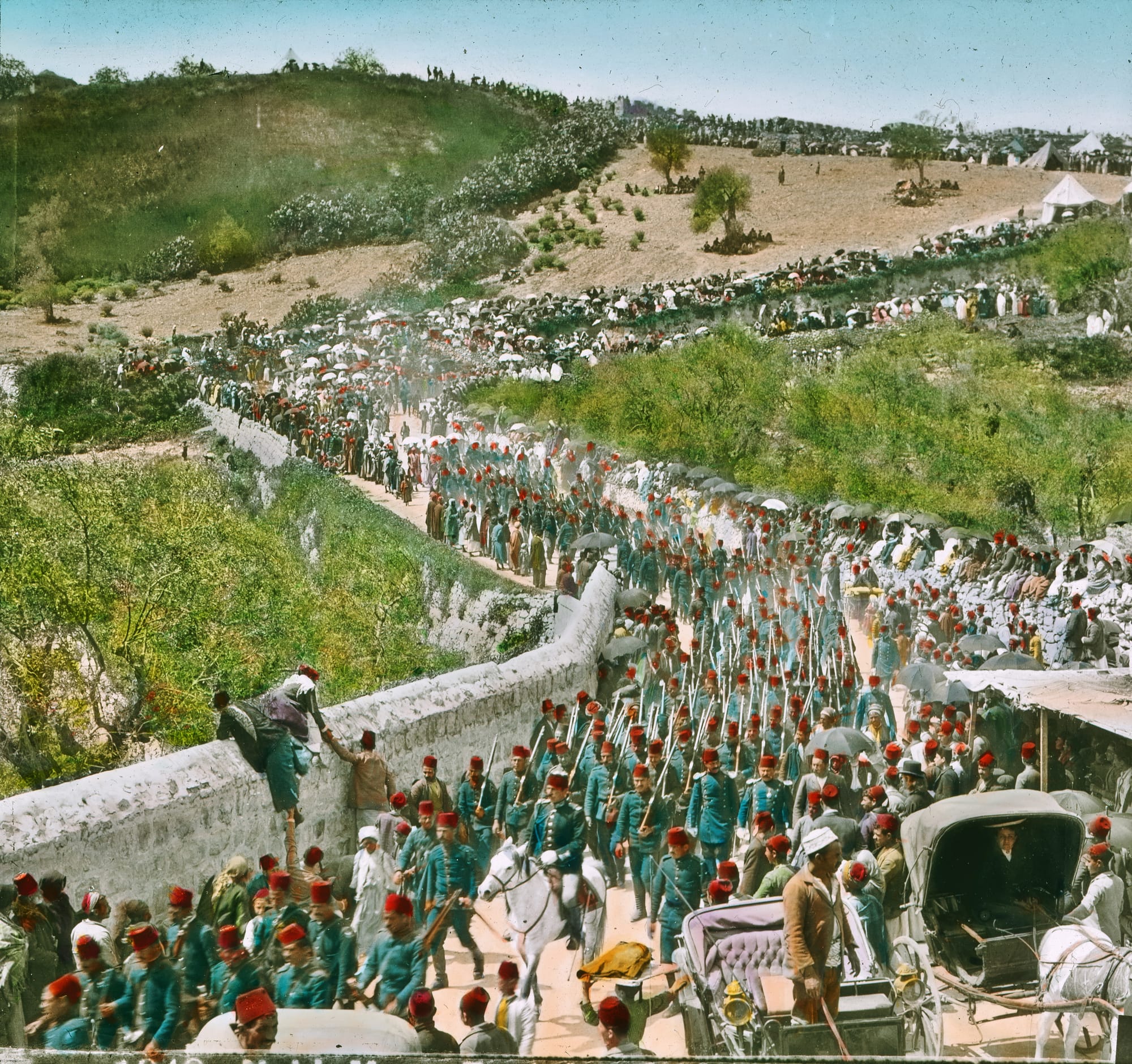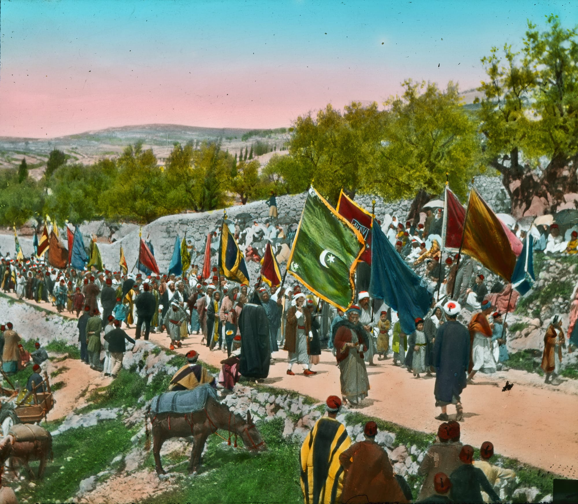 Outside the gallery on Istanbul’s ever-busy Istiklal Avenue, scenes of shop-happy mobs resembled those in the lurid, retouched color photographs of Palestine’s traditional Nabi Musa processions—pilgrimages honoring the prophet Moses—displayed inside. These pictures, courtesy of the Library of Congress and Bruno Hentschel of the Germany Protestant Institute of Archaeology, are breathtaking snapshots of life at the height of Muslim expression in Palestine: locals organized proudly in their strength of numbers, marching, praying, and reveling, under bright green banners.