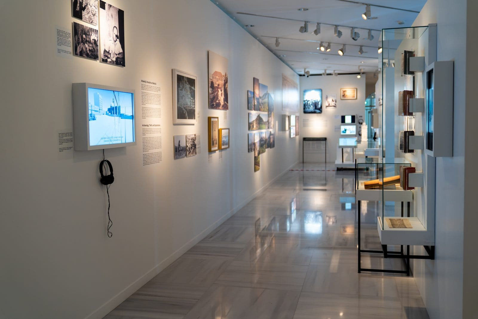 Though peppered with gems of Palestinian modernism, the exhibition was mainly a theater of objectification, an archival historiography of misrepresentation by European Orientalists. Several photographs exemplify this simplistic othering in which Palestinians are impersonalized amid wayward crowds and impenetrable boundaries. One image by Gustaf Dalman of the German Protestant Institute of Archaeology, titled Natives (1914), shows two turbaned men standing in long, folkloric robes—a scene stereotypically rendered for a touristic postcard or colonial ethnography. In a similar vein, Allenby Bridge Photograph (1967) by the United Nations Relief and Works Agency for Palestine Refugees in the Near East (UNRWA) depicts a mass of Palestinians in transit, some carrying infants, traversing the ruins of a destroyed overpass while an entourage of Western-attired bystanders look down at them from the top of the severed concrete—some leisurely under an umbrella and in the company of at least one photographer.