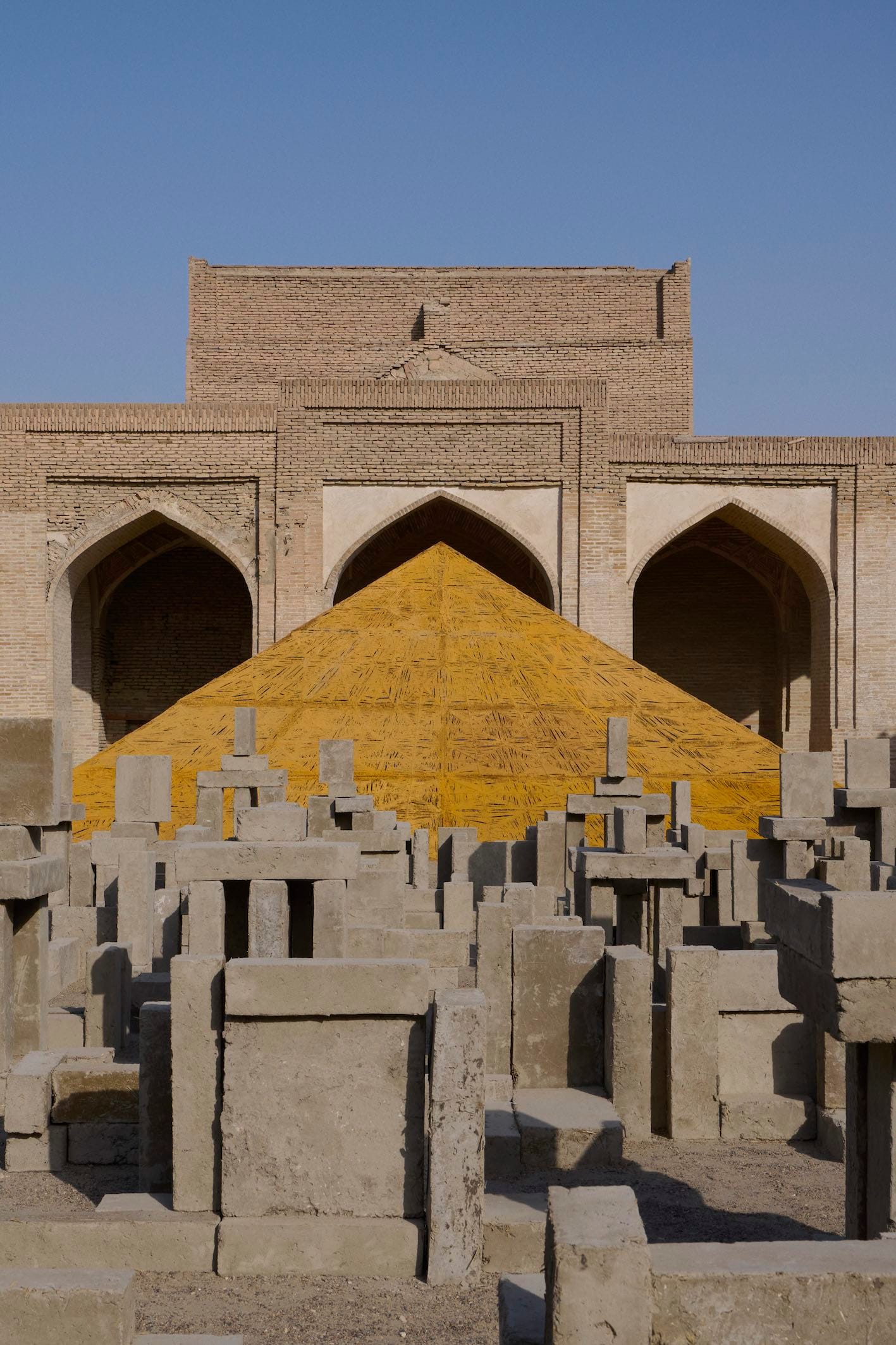 Installation views of ANTONY GORMLEY’s CLOSE, 2024–25, in collaboration with TEMUR JUMAEV (left); and DELCY MORELOS’s La Sombra Terrestre (The Earth’s Shadow), 2024–25, in collaboration with BAXTIYOR AKHMEDOV (right), at the Bukhara Biennial, 2025. Photos by Adrien Dirand. Courtesy the Uzbekistan Art and Culture Development Foundation, Tashkent.