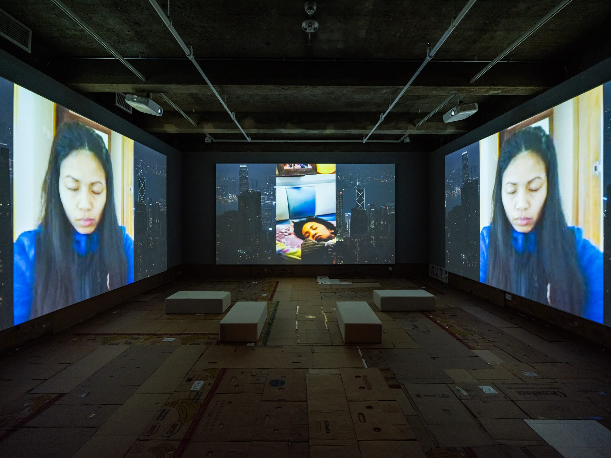 Lumapit Sa Akin, Paraiso (Come to me, Paradise) (2018) on the second floor was at once the most accessible and most complex in the show. Across a three-channel projection, a drone captures the POV of three Filipina domestic workers in Hong Kong, narrating a story of isolation through haphazardly filmed footage of their gatherings in Central, near City Hall. The gallery’s floor and walls were covered with flattened cardboard boxes locally sourced from New York, mimicking the practice of migrant workers in Hong Kong using them as makeshift shelters and seating mats in public spaces on their days off. In New York, where cardboard boxes are more associated with homelessness, the installation might have resonated differently—but perhaps homelessness is what an onlooker gleans from these scenes in Hong Kong. Typically living in tiny rooms connected to their employers’ kitchens, Southeast Asian domestic workers in Hong Kong spend public holidays hanging out under overpasses, in parks, and on beaches—places they can stay without cost. With their lodgings in Hong Kong belonging to their employers, their true homes are seen only through video calls with family.