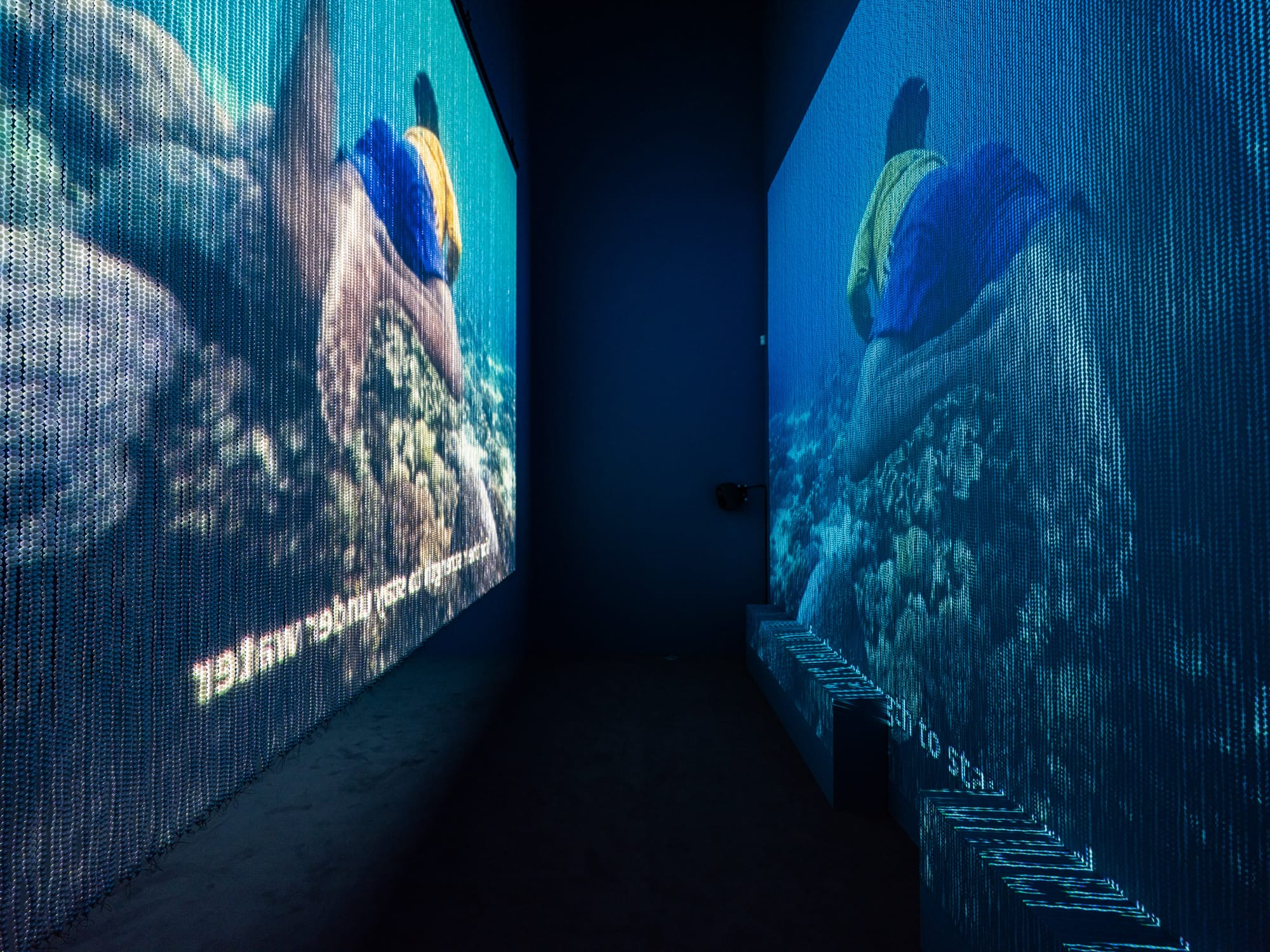 The last and most recent work, Search for Life II (2025), demonstrates a more mature approach to both presentation and storytelling. Chronicling the epic tale of the pearl trade across Asia and of the Asian diaspora in the UAE, the work is projected on the wall through a screen comprising artificial pearl-like beads, creating two layers of moving images. The film features pearl diving families in the Philippines and a village in China where workers clad in Wellies and plastic ponchos shuck truckloads of oysters for pearls. Alternating with scenes of those involved in pearling are interviews with young, middle-class Emirati women of mixed heritage, dressed in coordinated outfits like a K-pop girl group. They sing, dance, and discuss identity politics and their experiences growing up in the Emirates, a region that gained international attention through the pearl trade prior to the discovery of oil.