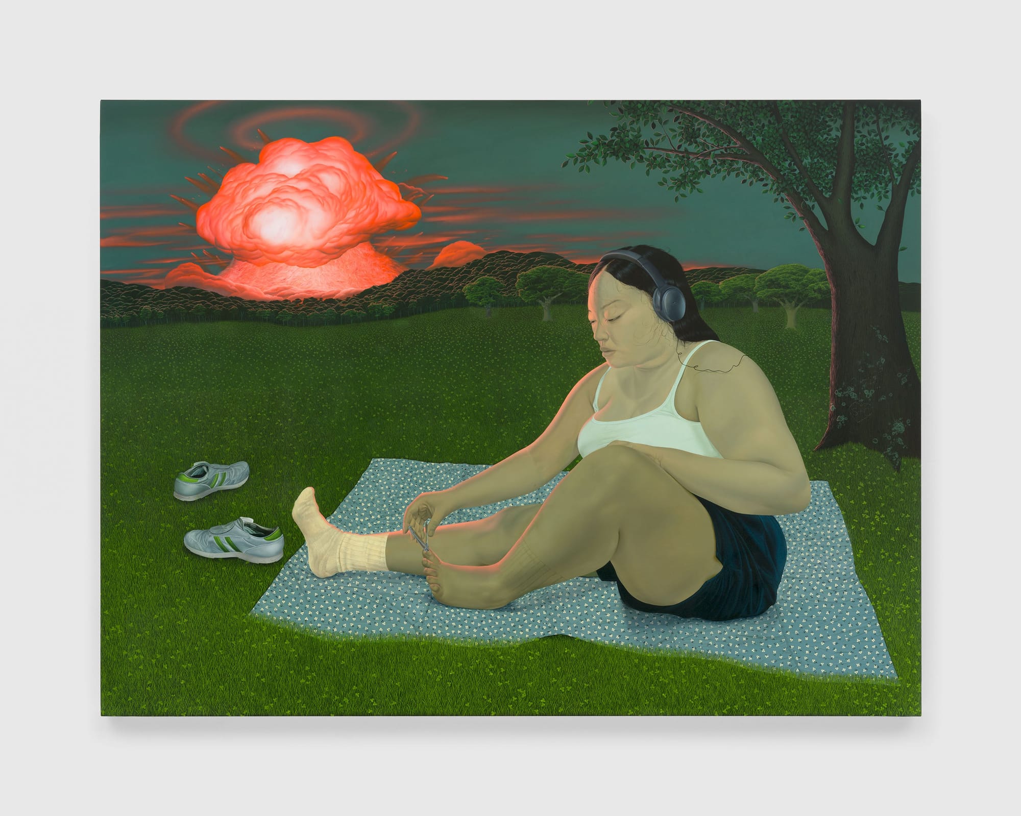 It Was Still Far Away (2024), featuring a solitary Gordon, offers a crucial counterpoint through isolation. The protagonist lounges on a picnic blanket, headphones on, clipping her toenails. Behind her, an apocalyptic explosion tears through the sky. Even as the blast stains her skin red, she remains unmoved. Her calm is not denial but radical presence—a body refusing to perform crisis on command. Sometimes endurance manifests as stillness; survival might mean declining the prescribed script.