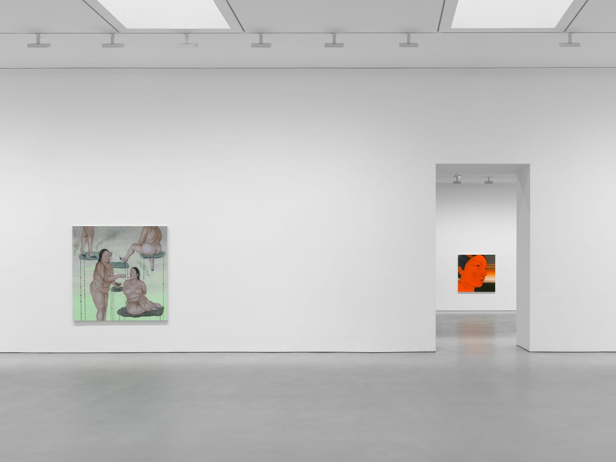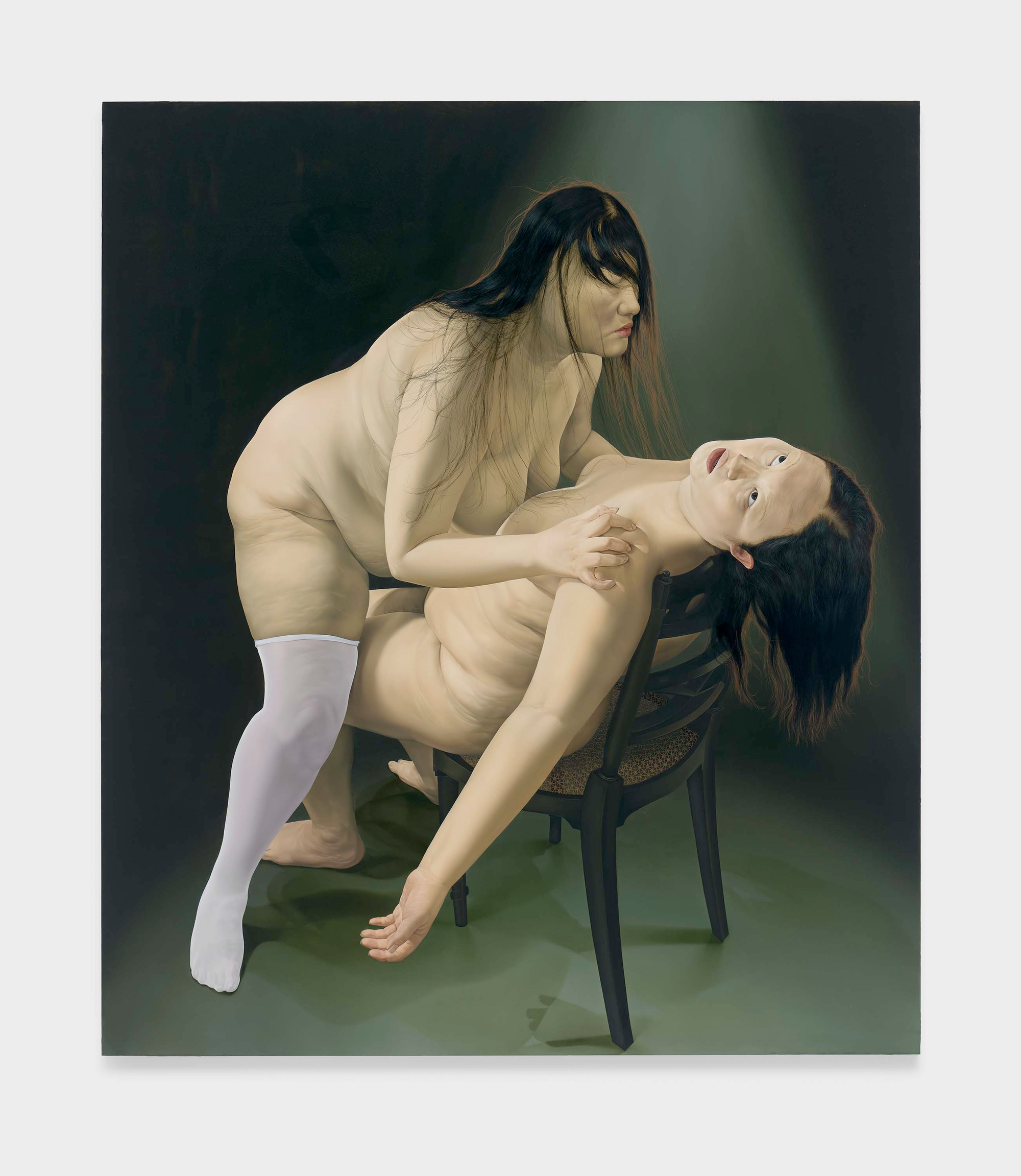 Behind aquarium glass, a woman is drowning at the hands of another. One figure forces another underwater, pressing down on her victim’s head. Floating hair, air bubbles, knees against glass—all rendered with fanatical precision—culminate in a stylized hyperrealistic tableau frozen mid-violence. Both figures in Pruning (2025) are Sasha Gordon—two among many that populated “Haze,” Gordon’s inaugural solo exhibition at David Zwirner. The painting establishes the show’s governing paradox: hyperrealism deployed not to clarify but to proliferate, not to resolve but to overwhelm.