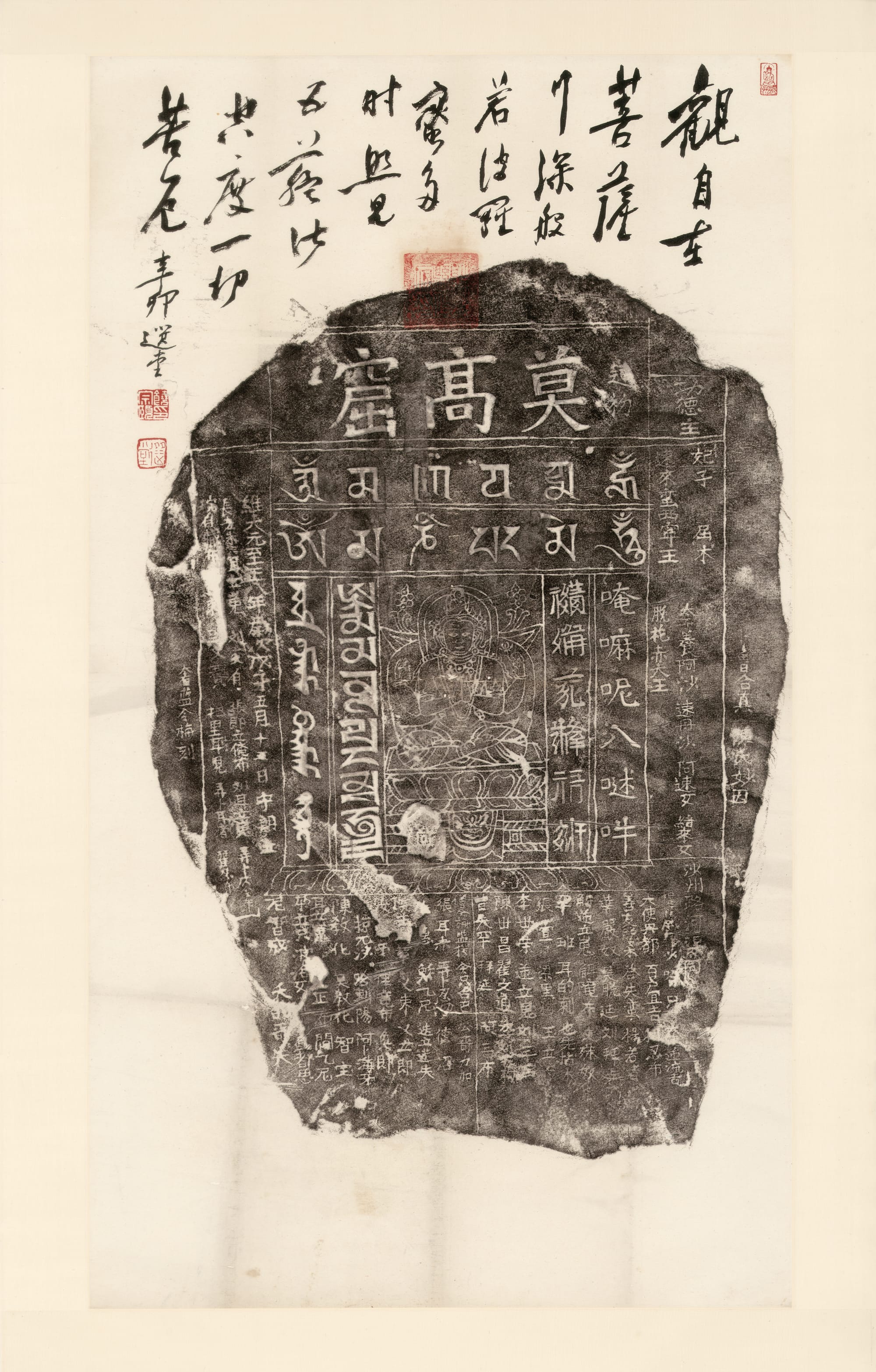 展覽中亦頻見與觀世音菩薩相關之展品。〈題莫高窟《六字真言碑》拓本〉(2011)中的原碑立於元末至正八年(1348),上以漢、藏、梵、西夏、回鶻、蒙古六種文字環繞觀音肖像刻其真言「唵嘛呢叭咪吽」,形制尤為罕見。拓本上題跋的《心經》有別於僅可音譯、旨在獲觀音感應之咒文,雖亦提及觀音,其核心卻在於以般若法理引導修行者遠離煩惱。於是,咒語與跋文便形成密教與顯教的互補。