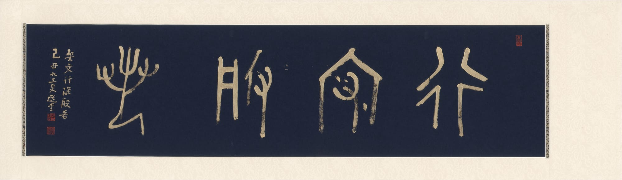除隸書外,饒宗頤亦分別以行草、甲骨及楷書反覆抄寫心經。〈行深般若〉(2009)採用商代甲骨文,此文字系統雖為漢字最古老的形態之一,卻遲至清末才為人發現,至今僅百餘年。饒宗頤以此遠古文字書寫《心經》,不僅展現自身於甲骨學釋文的成就,更已凌越佛教自東漢時傳入中國的歷史敍述:結合饒經常運用的紺紙金書形式,頗映證出般若智慧的莊嚴境界與佛學時空的宏大格局。另一於2016年寫成的《心經》冊頁則為場內眾多行草作品之一。饒宗頤當時已屆百歲高壽,行筆不時因手部顫抖而出現鋸齒狀線條,除字行結構歪斜外,行距亦過寬,可料想書寫時身體已極為衰弱。觀眾由饒宗頤晚年字跡,的確較難欣賞其書法成就,卻必定從中感受其對《心經》傾注畢生的精誠。