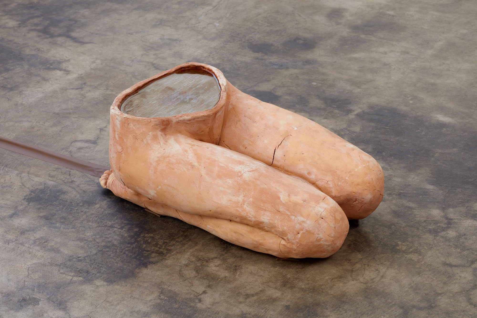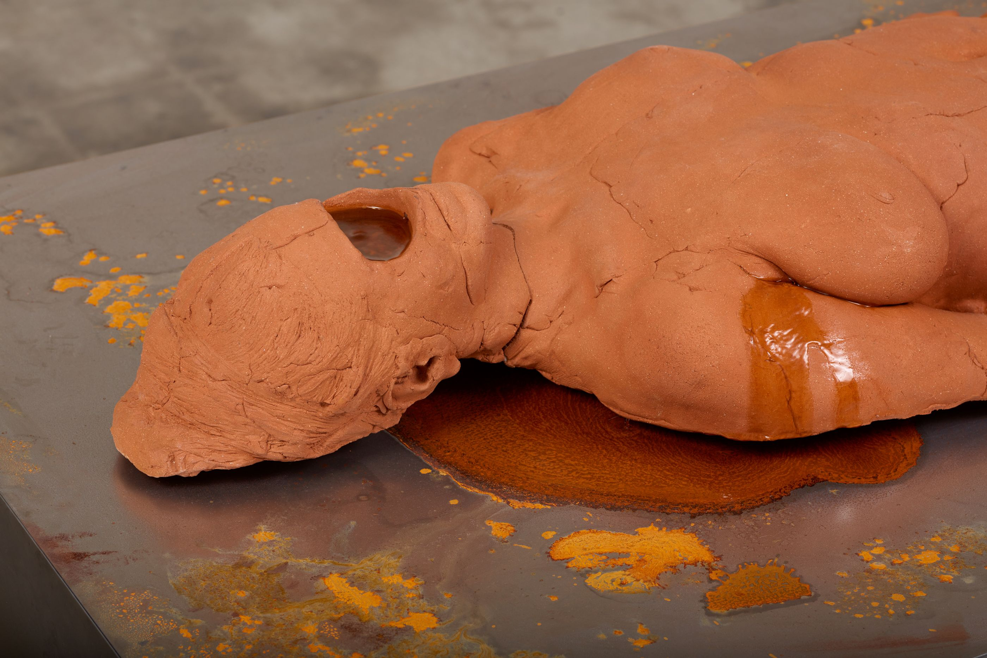 There are the cascading reactions within family and generational bonds. Anatomical clay casts based on Pirouzmand’s own body as well as that of her mother (the artist has also frequently cast portions of her grandmother’s form in the past) populated the sunny, seventh-floor industrial space of JOAN in downtown Los Angeles. The floor sculpture, kneeling, sinking (2025) is modeled after Pirouzmand’s lower body in a kneeling position, cut through the hip, connoting prayerful deference and vulnerability. At the center of this presentation was spring (2025–26), a full body cast reclining on a slab of steel, entrenched in a shallow pool of water that slowly eroded the clay corpus and rusted the steel.