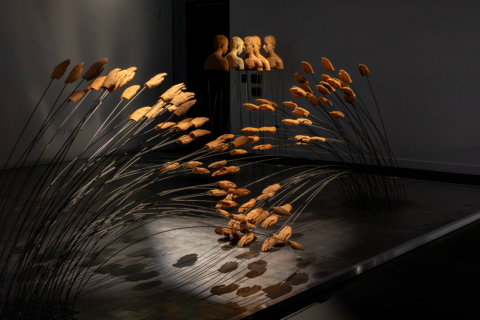 In Land (2026), clay casts of the artist’s bust jostle against each other upon long metal rods, their eyes closed. While the damage at first glance appeared minimal, closer inspection revealed that each bust had sustained a fine but distinct layer of wear upon almost every surface. No person is an island; not a single soul remains unscathed in the unfolding of the human trajectory.