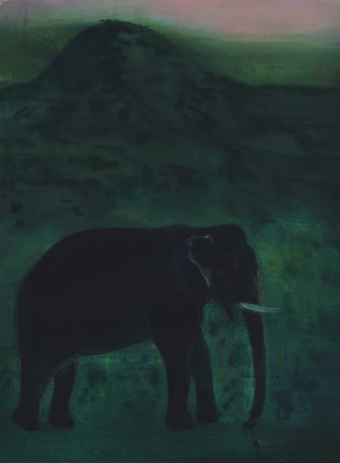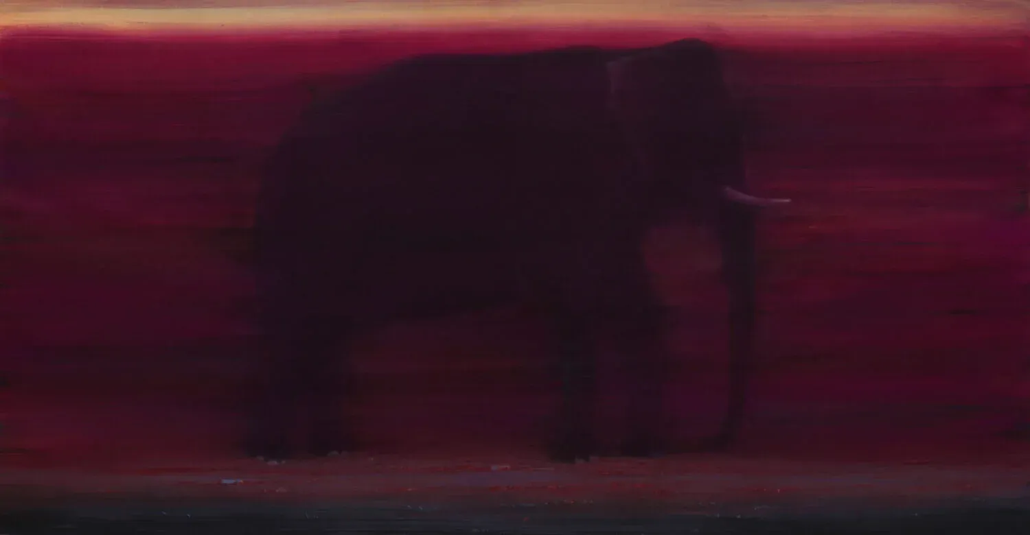 Two other paintings feature a silhouetted elephant, both of which are almost identical in form and stance. The first, also titled Prologue (2024–25), presents a seemingly ordinary and tranquil scene of an elephant walking through a lush green environment. In the much larger work, Oblivion (2024), an elephant fills the frame against a haunting crimson sky. Here, the painting appears surreal and unsettling—its saturated burgundy and purple shades conjure a restless and violent atmosphere, while the brash strokes create a sense of movement and resistance. A closer look reveals what looks like architectural debris beneath the elephant’s feet, littered across the ground, barely visible in the apocalyptic glow. The elephant in Oblivion emerges almost like a ghost, a symbol of ecological guilt haunting the ruins of human intrusion.