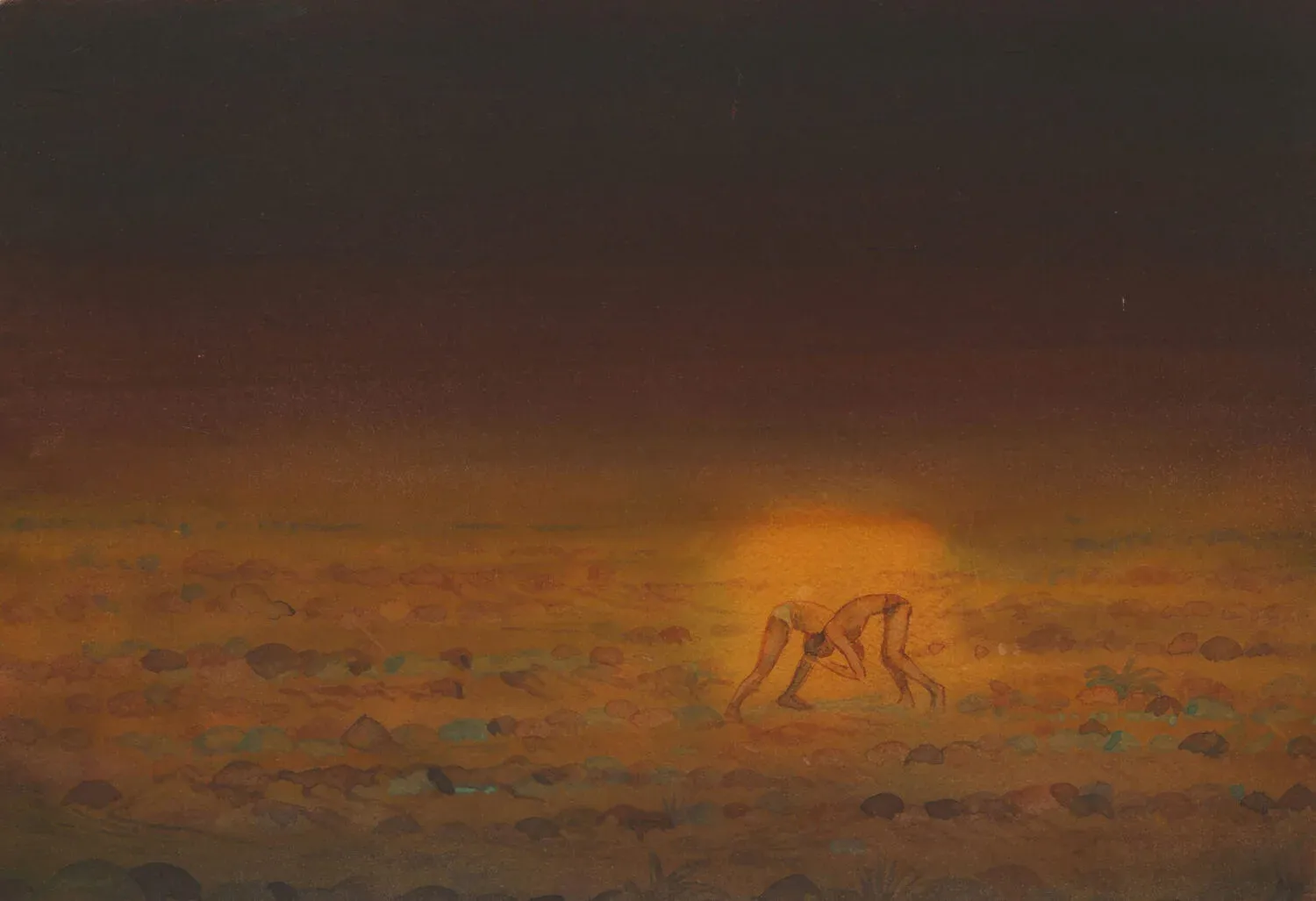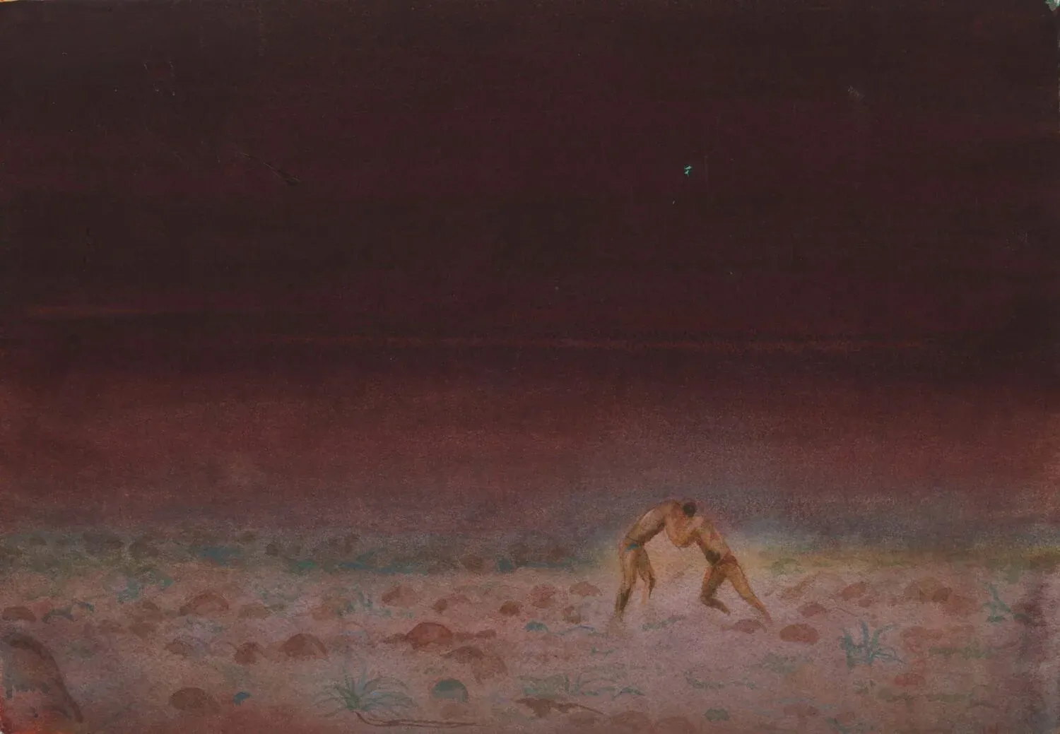 A sense of futility suffuses two paintings, titled Prologue (both 2024–25), which show two men wrestling in a vast barren land. The pair is caught in a charged yet intimate brawl, their forms aglow against the rocky terrain—what the winner will attain, however, is unclear. One might read the conflict as man’s innate power struggle with himself: having defeated nature, leaving it barren, man finds only himself left to battle. The meaninglessness of the fight comes into focus through the absence of context, human or natural. Perhaps this suggests a paradox: in conquering nature, humanity defeats itself.