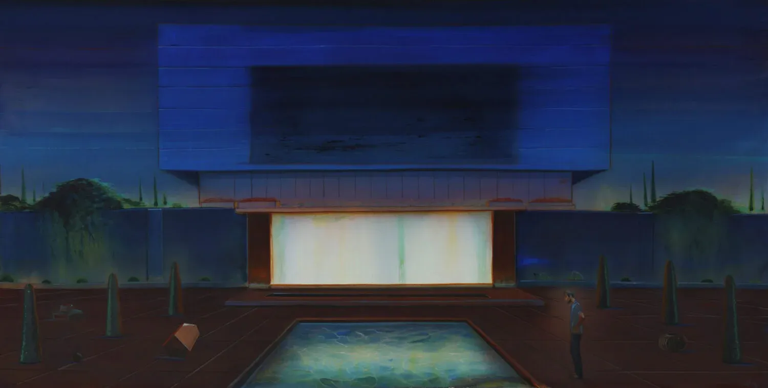 In Archipelago (2024), the building’s gentle illumination becomes a symbol of human intervention. Here, the modernist structure’s facade mirrors the sky’s hues, while light seeping out from the windows on the ground floor illuminates only the swimming pool. Boundary walls separate the ordered space from the unkempt trees in the darkness beyond, creating a stark contrast with the meticulously manicured landscape in the foreground. Meanwhile, a lone, pensive man stands by the pool. His solitary figure and the building echo each other in their isolation—both appear oddly vulnerable against the surrounding darkness, almost like creatures in an awkward displacement.