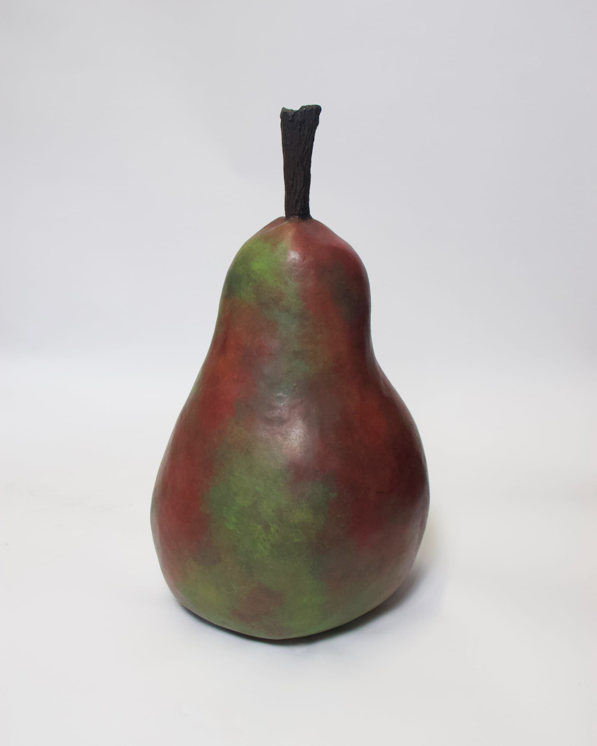 MING FAY, Pear (left), 2021, bronze, 49.5 x 28 x 25 cm. Courtesy Estate of Ming Fay and kurimanzutto, Mexico City; and installation view of Young Sprout (right), 1996, mixed media, 45.7 x 20.3 x 17.8 cm, at The Campus, Hudson. Courtesy The Campus, Claverack, New York.