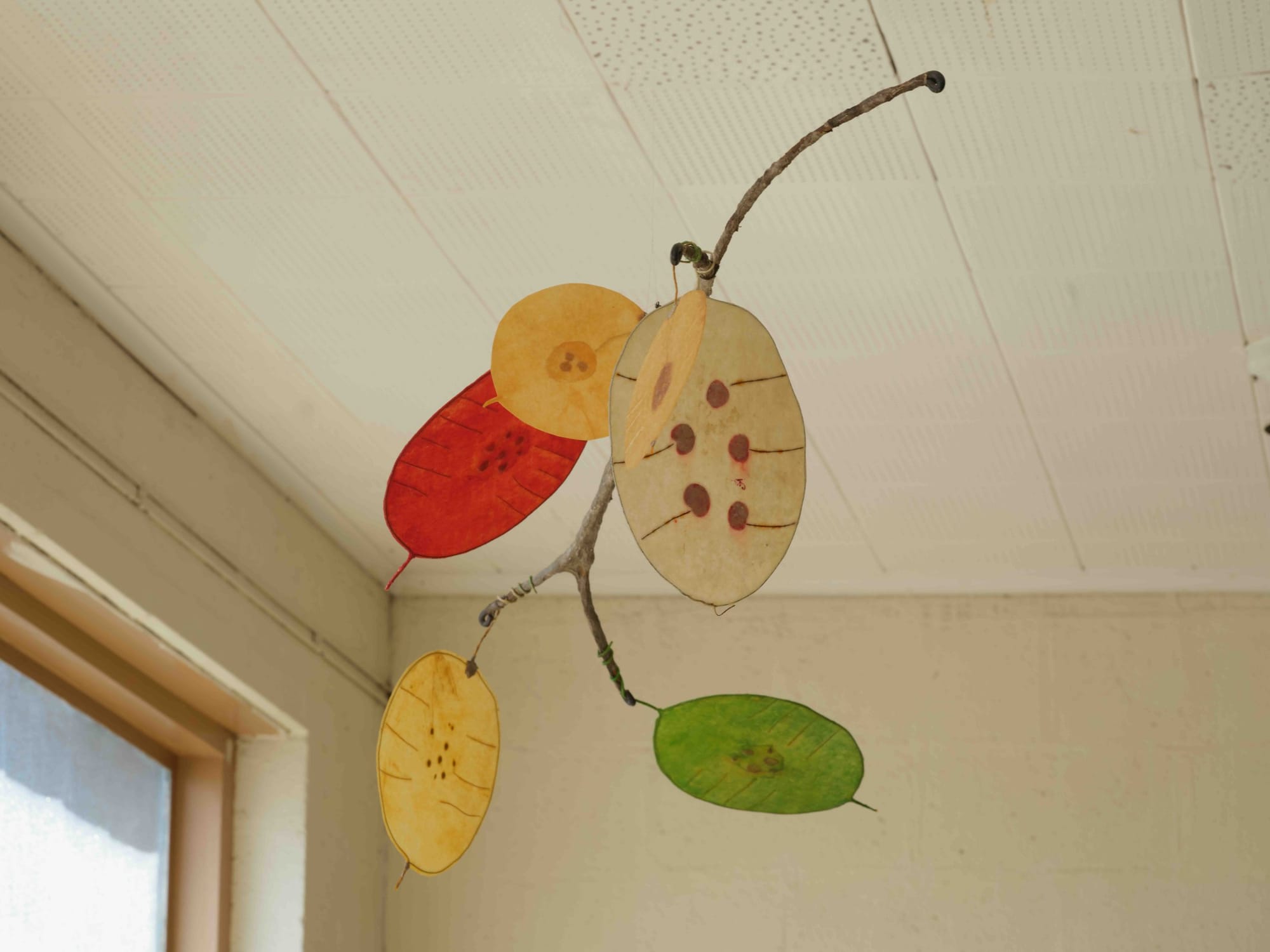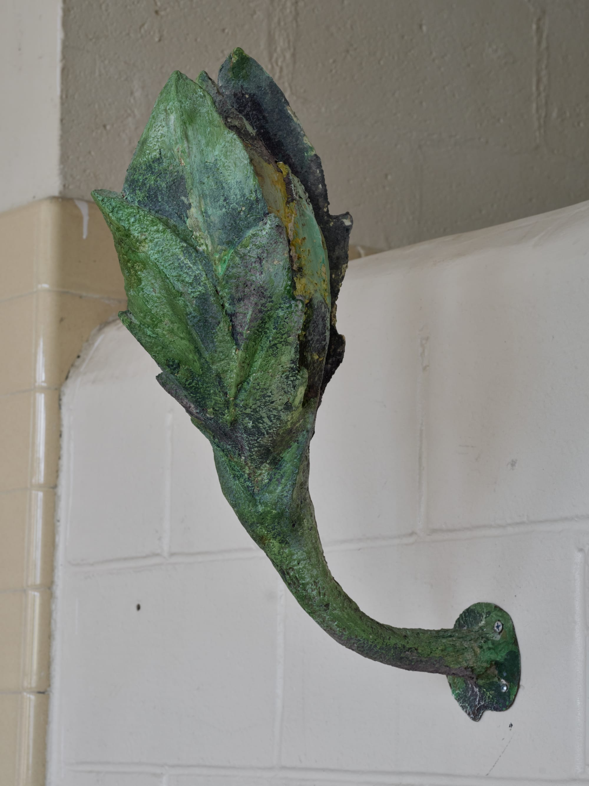 When the autumn afternoon sun streamed through the frosted windows, illuminating the translucent leaves of Fay’s Money Tree sculptures, it almost had the glow of stained glass. The calm that filled the once-bustling locker room lent it a sacred air. Some locker doors were ajar, revealing small ceramic sculptures—figurines, a bust, and a skull. You could imagine a student once stored his football helmet in there. Several sculptures sat atop the lockers, and one looked like a faceless bust overgrown with lichen and crowned with antlers. It gave me Dead Poets Society (1989) vibes, specifically a scene where Neil, the talented prep school student (played by a fresh-faced Robert Sean Leonard), wore a crown of twigs as Puck in a local theater’s rendition of A Midsummer Night’s Dream. The earthy tone of the floor and wall tiles, the exposed concrete and cinder blocks where lockers had been removed, and the geometry of the space all harmonized unexpectedly with Fay’s colorful, irregular forms. There were brilliant shades of okra green from perhaps the hybrid or imaginary tail or shell of arthropods, while a garnet red gradually bled into ocher and green on an Anjou pear. Even the porous, honeycomb-like texture of a white wall-hanging piece, resembling a wasps’ nest, could pass as a mutated double of a urinal due to its size, color, material, and placement.