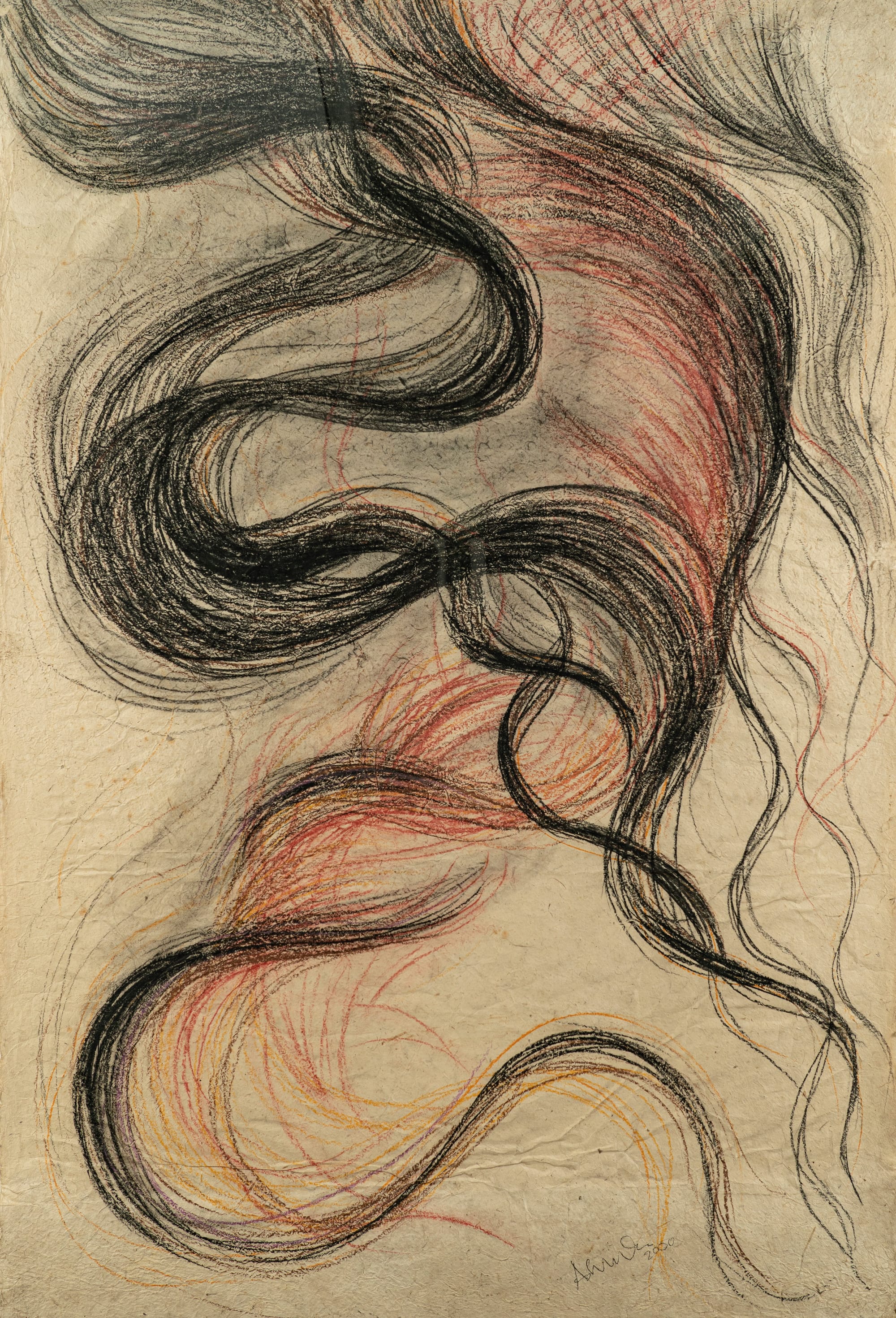 Hair emerged as a recurring motif. In Ashmina Ranjit’s drawing, Hair Warp – Travel Through Strand of Universe, 8 (2020), black and red strands on lokta paper recast hair—a potent Hindu symbol—as a site of feminine agency, with the color red—long tied to marriage and barred to widows—reclaimed as power. The slippage between hair and thread—parallel carriers of lineage and memory—reappeared in Tarik Kiswanson’s Passing (2020), an X-ray overlay of an 18th-century Jordanian dress and a contemporary tracksuit. Hand-stitched red threads pierce the image and drift beyond its surface, extending its meditation on inheritance, migration, and the fragile seams that bind generations.