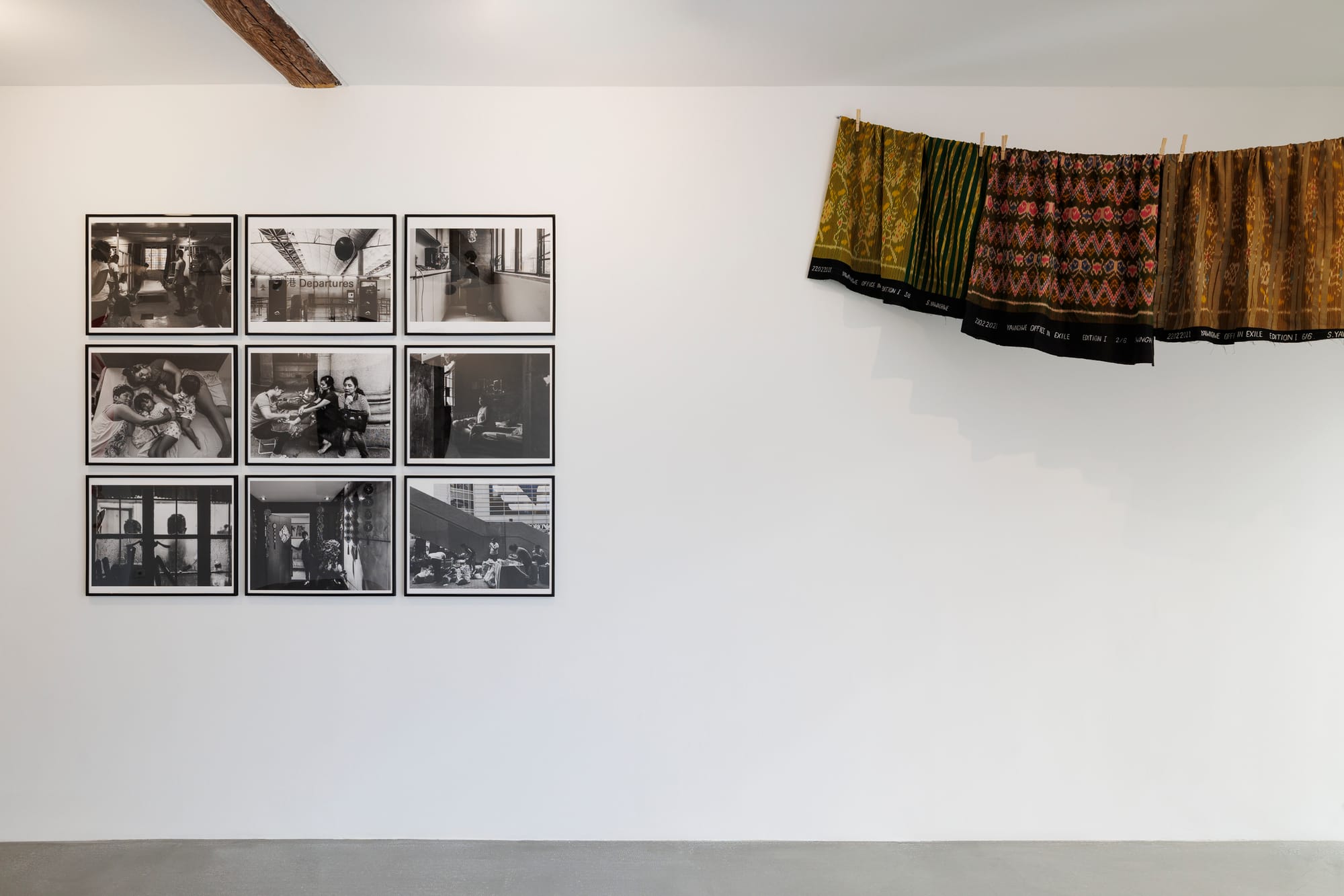 These fantasies of supernatural female danger also bleed into everyday superstition. Sawangwongse Yawnghwe’s 22022021, Yawnghwe Office in Exile (2021) makes this palpable. Near the entrance, Burmese women’s longyis hung across a clothesline that visitors had to duck beneath, echoing a protest tactic after the 2021 coup. Because such garments were believed to sap a man’s hpone—his spiritual authority—soldiers were forced to remove each line before advancing, turning laundry into a barricade. Sourced along the Thai-Burma border, the longyis bore marks of displacement, their coup dates rendered in crushed shell pigment. Tender yet defiant, they linked personal exile to collective struggle.