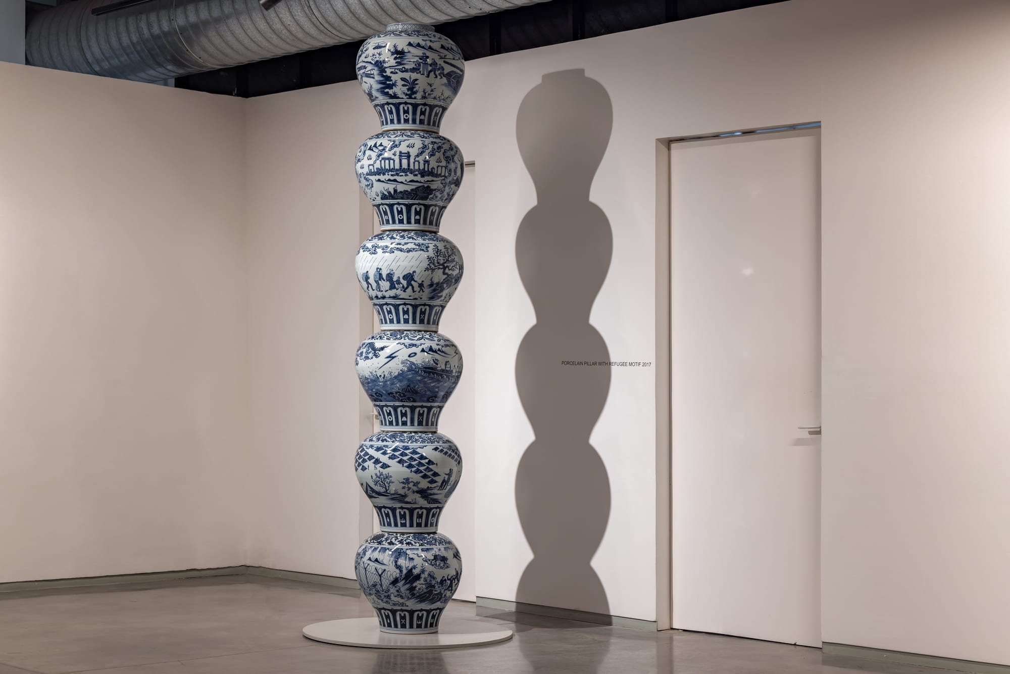 The tallest sculptural piece on view, Porcelain Pillar with Refugee Motif (2017), is composed of six qinghua vases arranged into a single column. Here, Ai foregrounds the vessels’ fragility as a vehicle for narratives of migration and displacement. The surface of each vase depicts intricately painted scenes of women, men, and children fleeing from armed conflict—vertically stacked together, the almost spherical and identically shaped containers transcribe this violence and anxiety into an endless loop. Ai’s repeated use of porcelain in his practice serves not so much as craft revivalism than as a form of material historiography that bears a genealogy of labor, trade, and power.