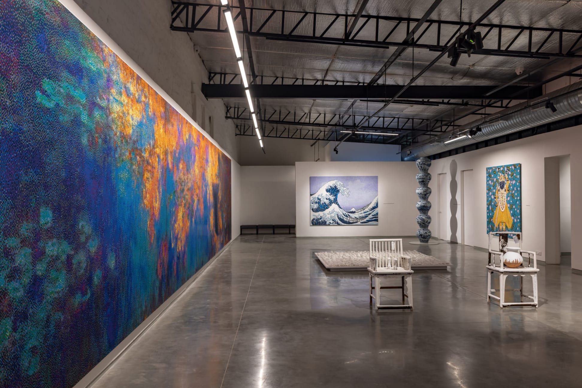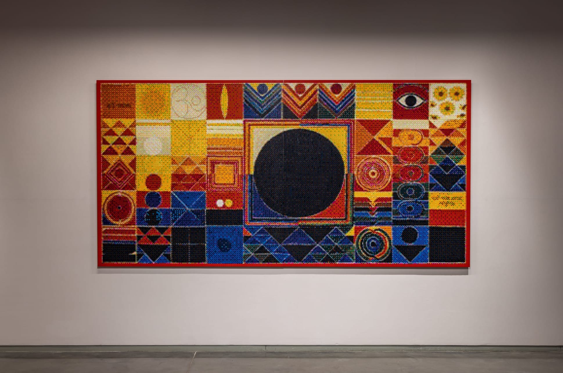 While the exhibition was anchored by two large-scale Lego compositions, Surfing (After Hokusai) (2025) and Water Lilies (2023), Ai had also created new pieces in response to works by the late Indian modernists SH Raza and VS Gaitonde, as well as Pichwai—a devotional painting style originating from 17th-century Rajasthan, whose name translates to “that which hangs from the back.” Rendered in the same modular idiom as his aforementioned reinterpretations of Monet and Hokusai, these works extend Ai’s investigation of canon formation into an Indian art-historical lineage. For instance, his Lego replica of Raza’s 2006 serigraph-on-paper, Surya Namaskar (Sun Salutation), reimagines and further abstracts the Indian artist’s geometric canvas, paying tribute to the sun as a symbol of life and cosmic energy by incorporating Ai’s own voice through tiny building blocks. These works are not mere homages: they examine how context-specific visual forms are absorbed into global systems of circulation and eventually uprooted from their original meanings.