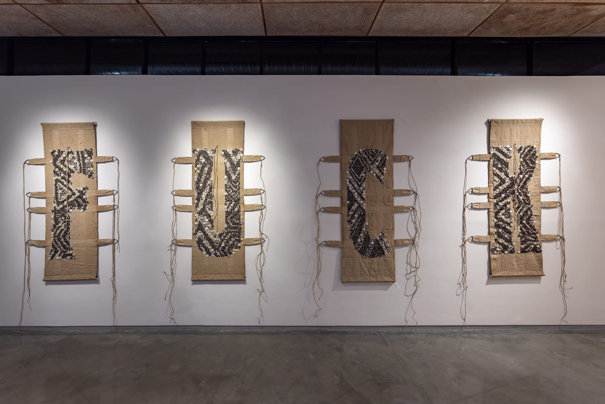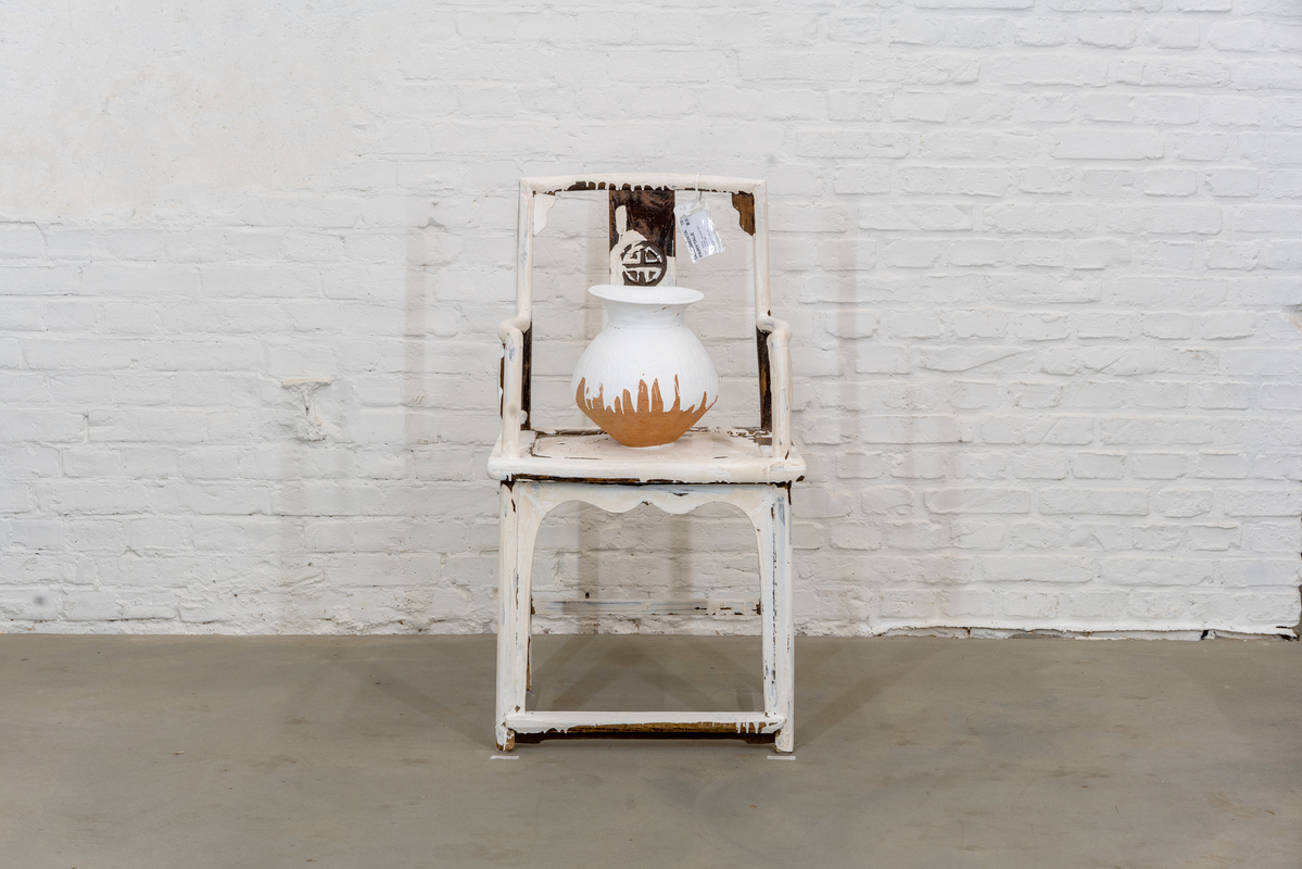 More outspoken registers appeared in the artist’s recent projects, such as F.U.C.K. (2024) and Whitewashed remnants of History of the State of Emerging Future Works (2025), shown publicly for the first time. The former comprises four connected World War II military stretchers with buttons sewn on to spell out the titular expletive. A deliberately vociferous display, the button-laden banner functions as a critical condensation of Ai’s research into textile history and industrialization. Meanwhile, the latter is a locally sourced earthenware pot perched neatly atop a wooden chair, both messily drenched in white paint. The haphazardly paint-soaked installation points to Ai’s preoccupation with erasure as a strategy of control, whereby the “truth” is often clumsily concealed—yet obviously so.